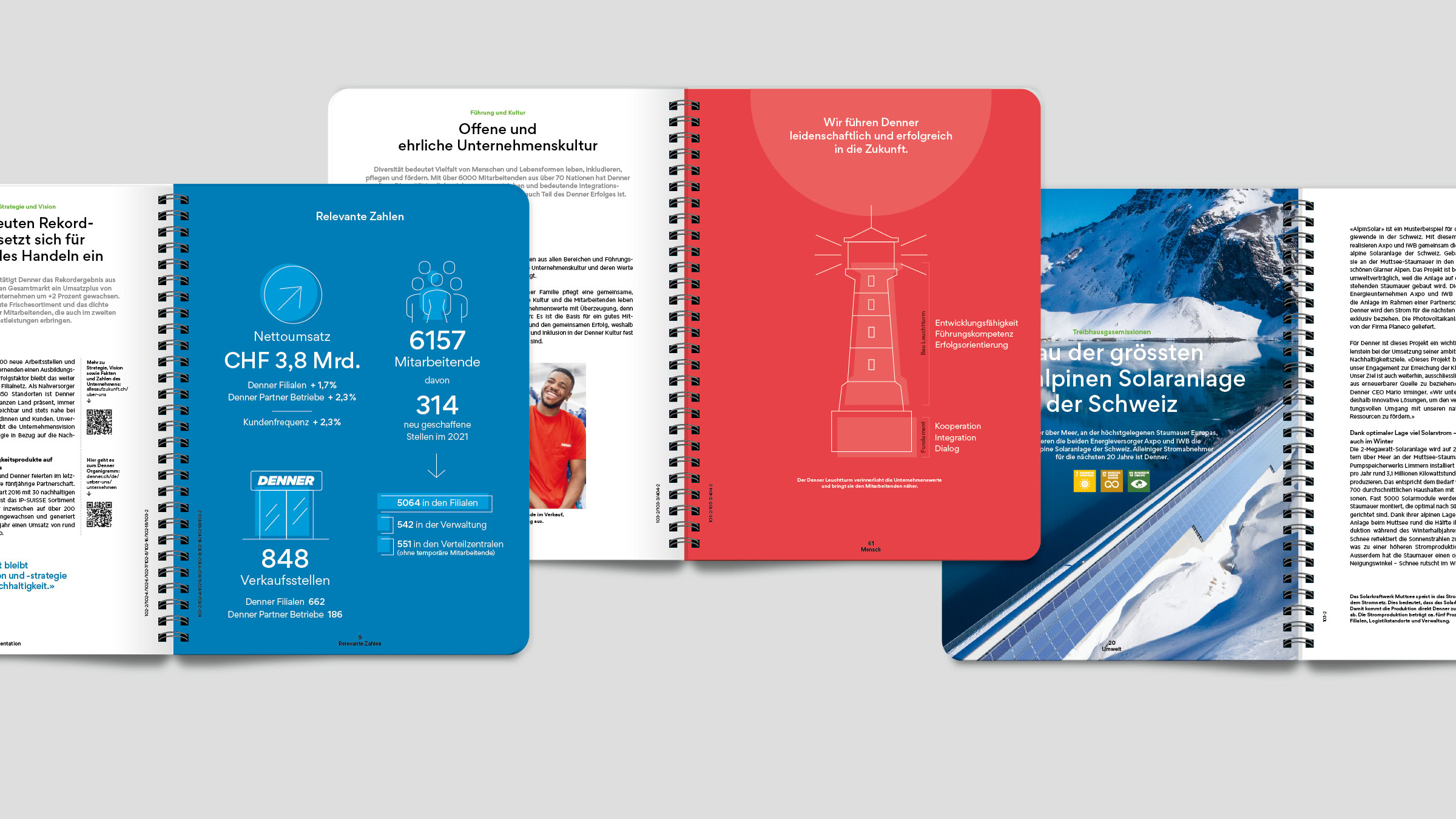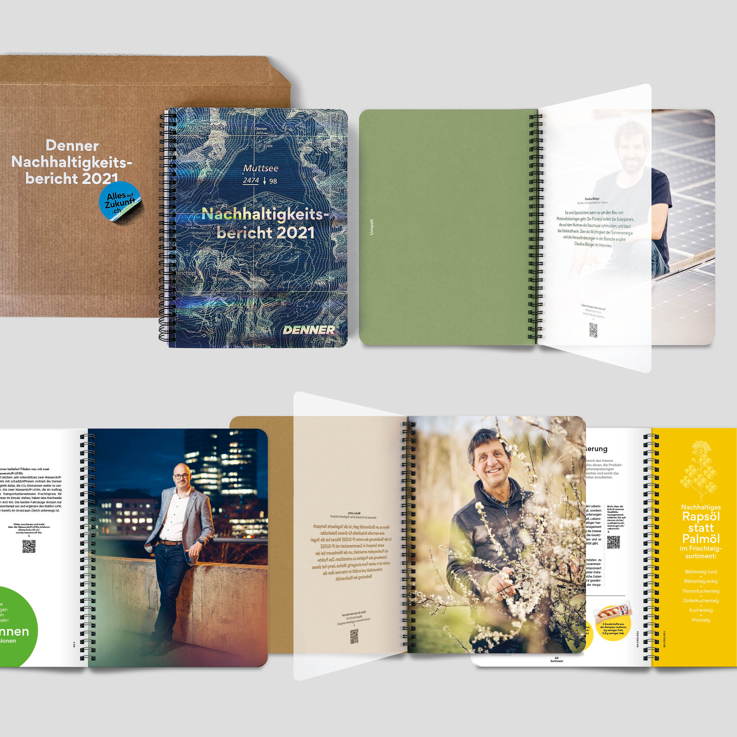 Seit 2020 gestalte ich im Team bei Isler Tomasi den Nachhaltigkeitsbericht von Denner im Einklang mit der Nachhaltigkeitsmarke «Alles auf Zukunft», die 2021 eingeführt wurde. Für den Bericht entwickelten wir ein Editorial Design für Print, das eine Brücke zur begleitenden Microsite allesaufzukunft.ch schlägt.